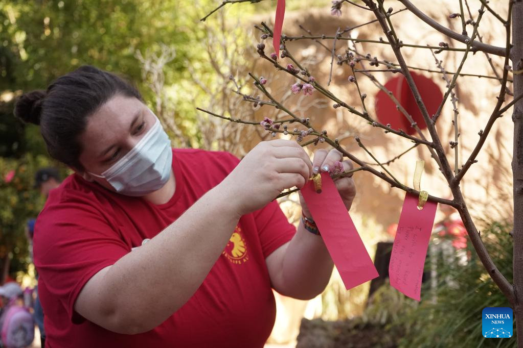 A woman attaches a note of wishes on the wish tree at San Diego Zoo, in San Diego, California, the United States, on Feb. 4, 2023. The San Diego Zoo, which has the largest number of annual visitors among U.S. zoos, kicked off a two-day special event on Saturday to celebrate the Chinese New Year. (Photo by Zeng Hui/ Xinhua)