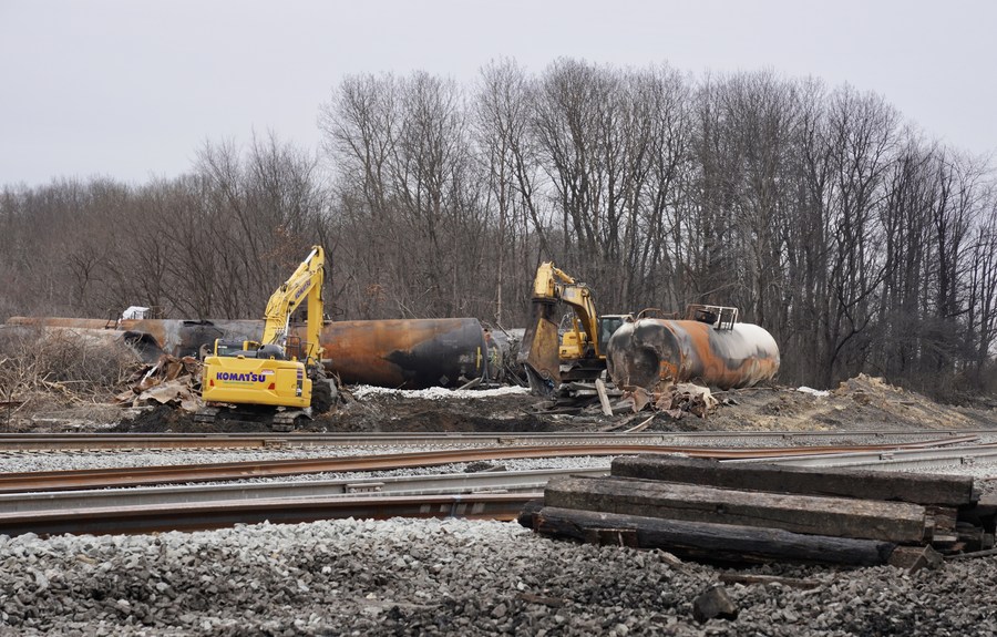Excavators dig up contaminated soil on the site of the Feb. 3 derailment on the outskirts of the village of East Palestine, Ohio, the United States, on Feb. 14, 2023. (Photo by Phil Zhang/Xinhua)