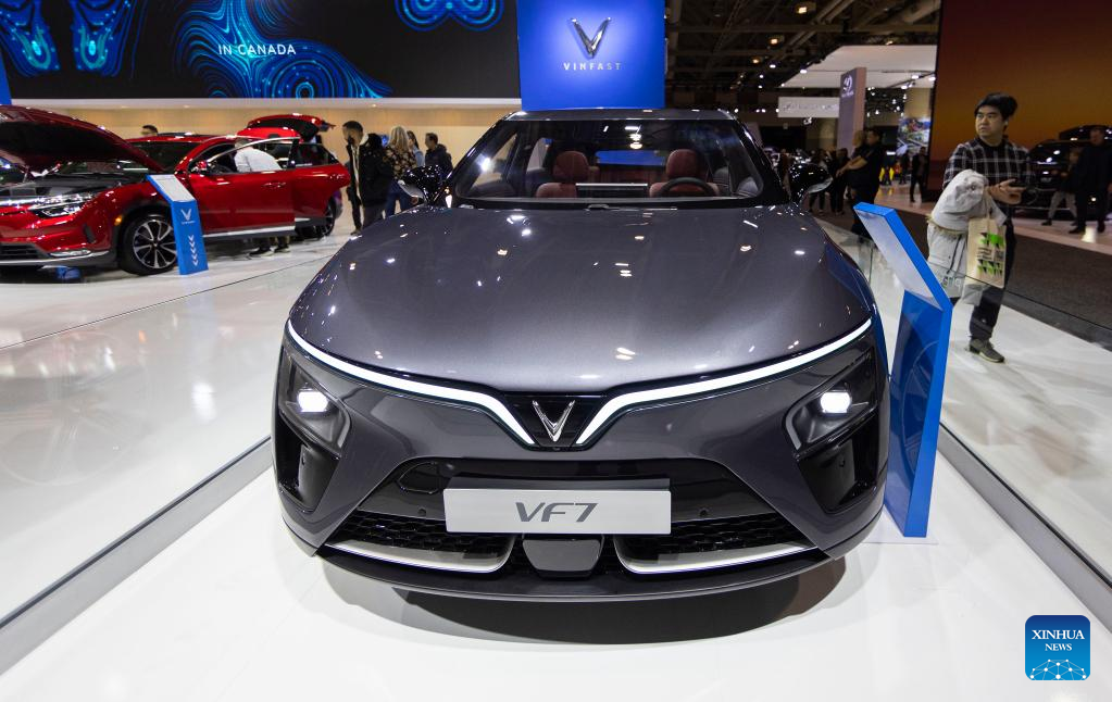 A VinFast VF7 electric vehicle is seen during the 2023 Canadian International AutoShow in Toronto, Canada on Feb. 17, 2023. Showcasing the latest cars, trucks, SUVs, concept cars, exotics, electric vehicles and more, the annual 10-day autoshow kicked off here on Friday. (Photo by Zou Zheng/Xinhua)
