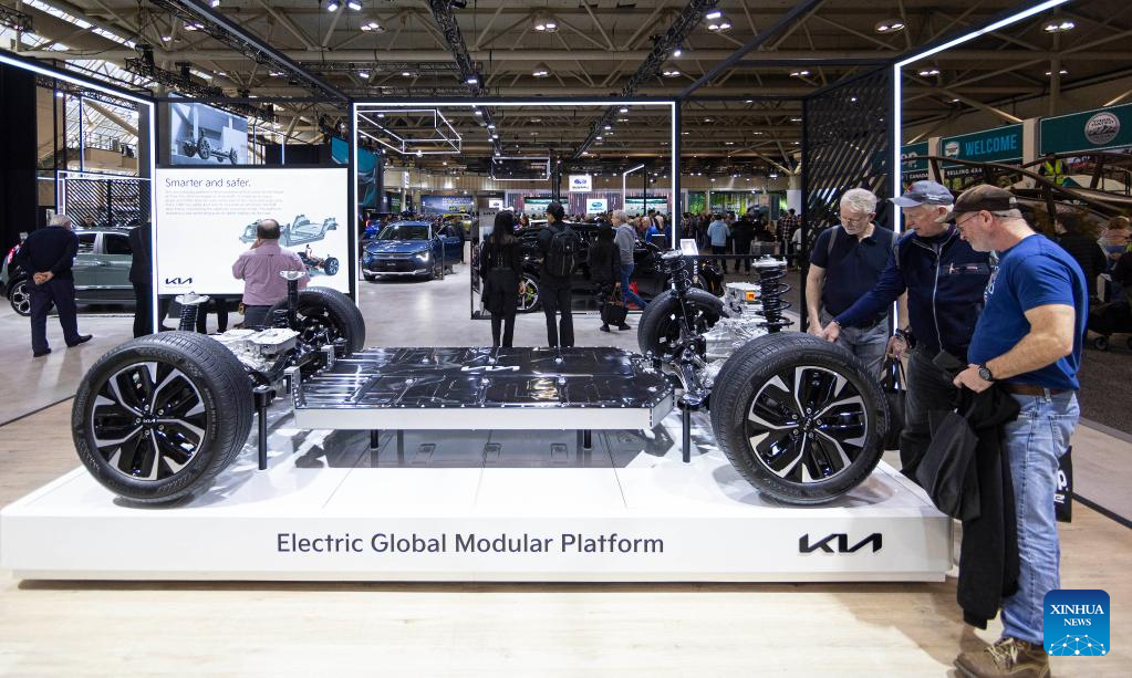 People look at Kia's Electric Global Modular Platform components during the 2023 Canadian International AutoShow in Toronto, Canada on Feb. 17, 2023. Showcasing the latest cars, trucks, SUVs, concept cars, exotics, electric vehicles and more, the annual 10-day autoshow kicked off here on Friday. (Photo by Zou Zheng/Xinhua)