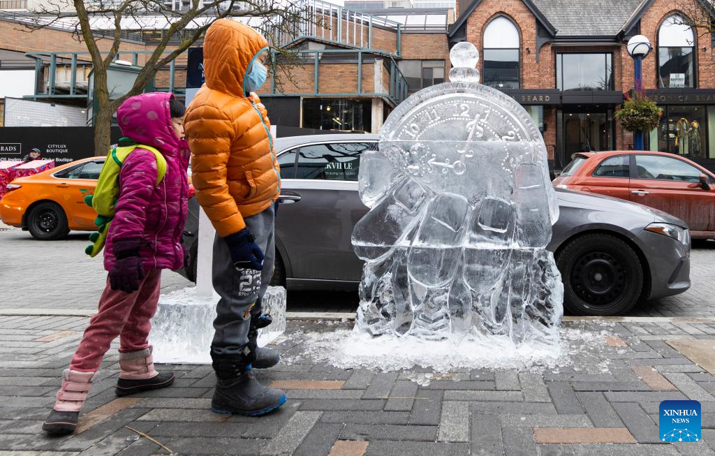 Children look at an ice sculpture during the 2023 Bloor-Yorkville Icefest in Toronto, Canada, Feb. 18, 2023. More than 40 ice sculptures were displayed at the event. (Photo by Zou Zheng/Xinhua)