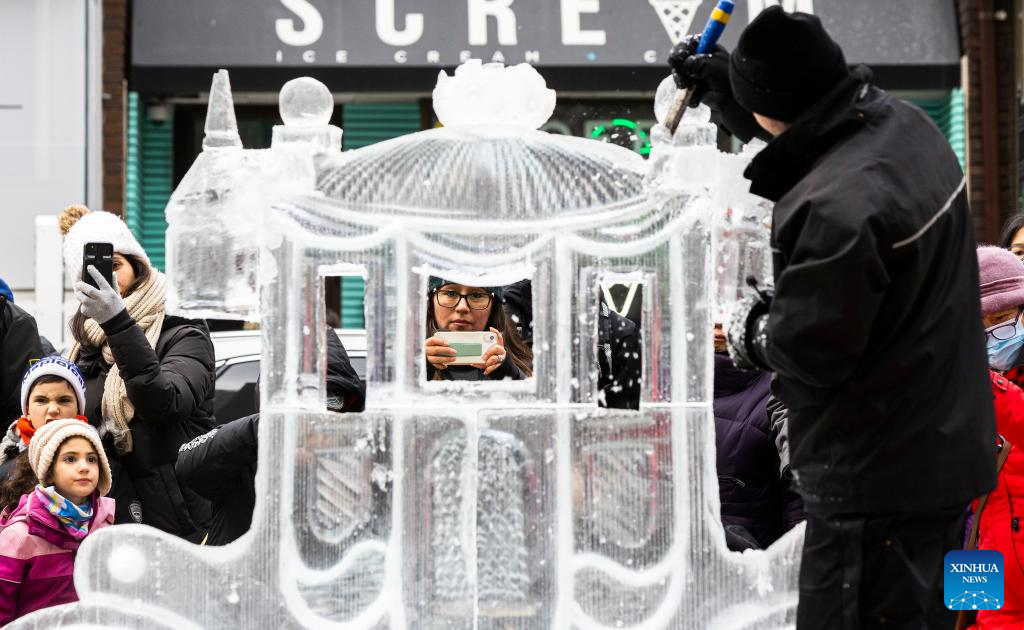 People take photos of an ice sculpture during the 2023 Bloor-Yorkville Icefest in Toronto, Canada, Feb. 18, 2023. More than 40 ice sculptures were displayed at the event. (Photo by Zou Zheng/Xinhua)