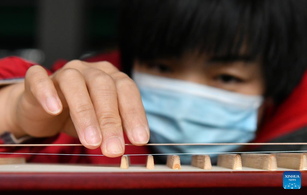 A worker tunes a traditional Chinese musical instrument at a workshop in Suning County, north China's Hebei Province, Feb. 18, 2023.