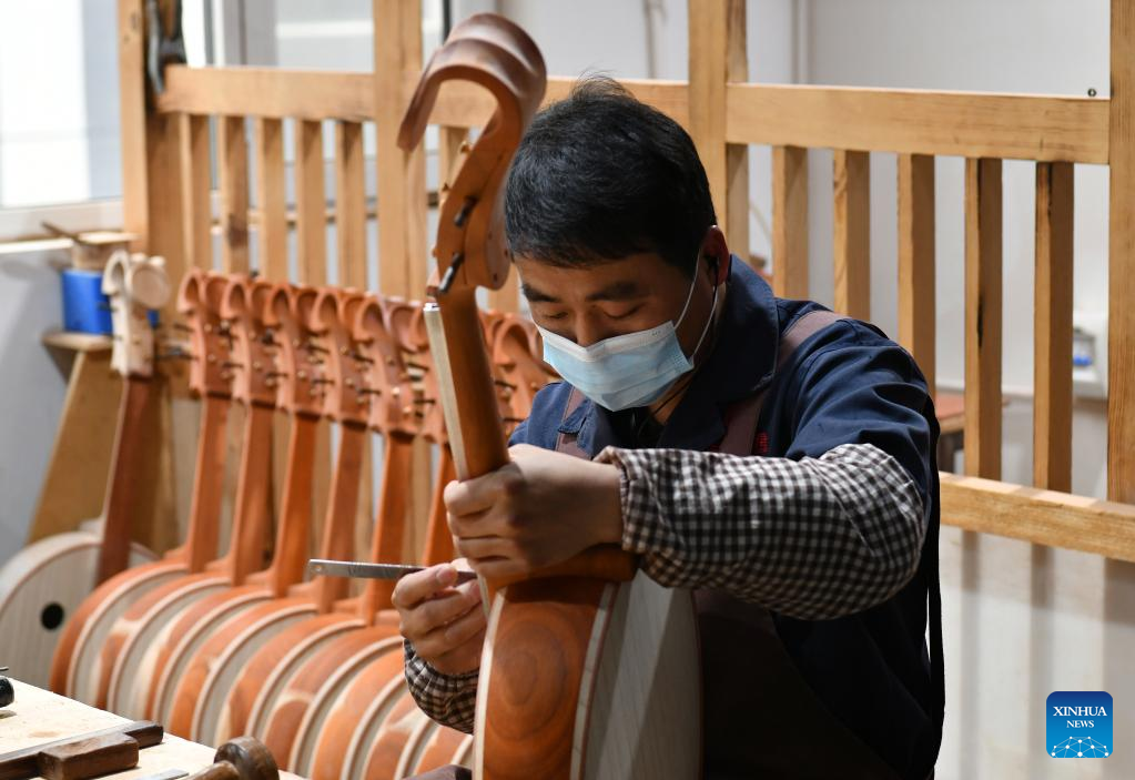 A worker makes a traditional Chinese musical instrument at a workshop in Suning County, north China's Hebei Province, Feb. 18, 2023.