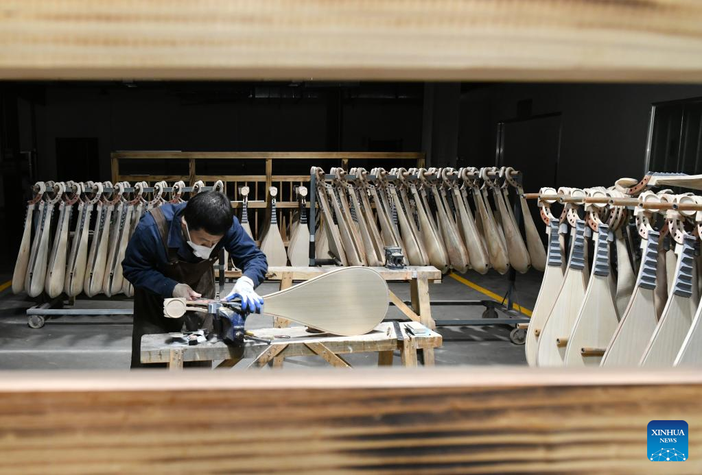 A worker puts traditional Chinese musical instruments in place at a workshop in Suning County, north China's Hebei Province, Feb. 18, 2023.