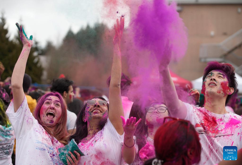 People celebrate Holi, the festival of colors, at the University of British Columbia in Vancouver, British Columbia, Canada, March 11, 2023. (Photo by Liang Sen/Xinhua)