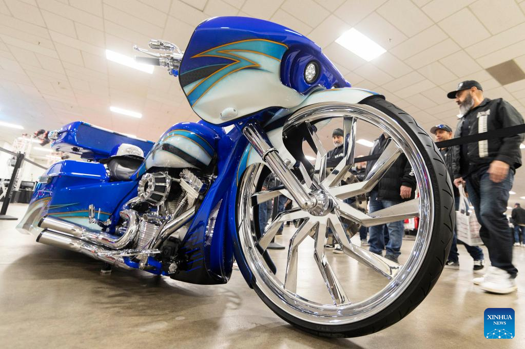 People look at a custom motorcycle during the 2023 Toronto International Spring Motorcycle Show in Mississauga, the Greater Toronto Area, Canada, on April 2, 2023. (Photo by Zou Zheng/Xinhua)