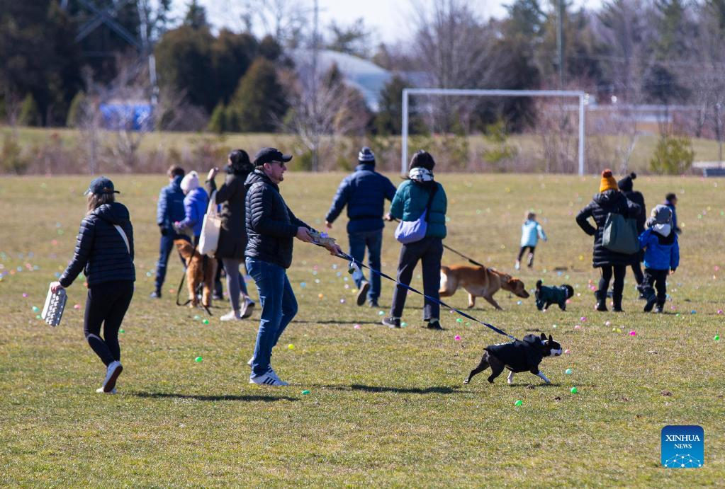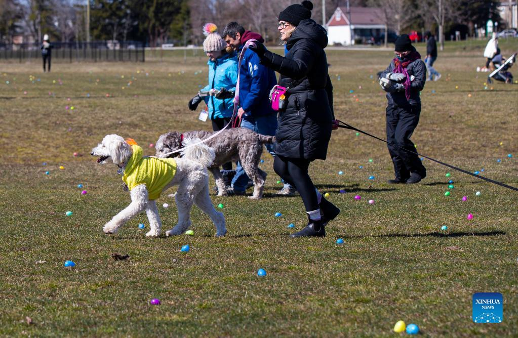 Pet dogs search for eggs with owners during the 2023 Easter Egg Hunt for Dogs in Hamilton, Ontario, Canada, on April 7, 2023. (Photo by Zou Zheng/Xinhua)