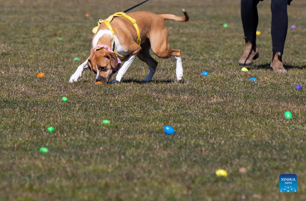 A pet dog searches for eggs during the 2023 Easter Egg Hunt for Dogs in Hamilton, Ontario, Canada, on April 7, 2023. (Photo by Zou Zheng/Xinhua)