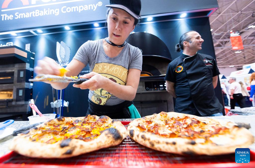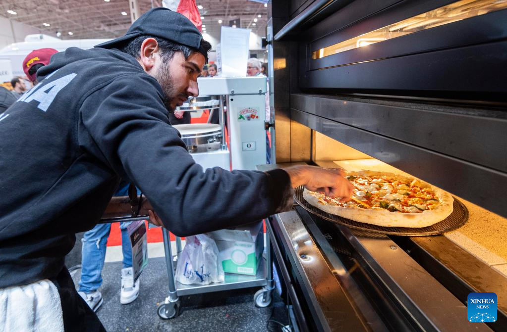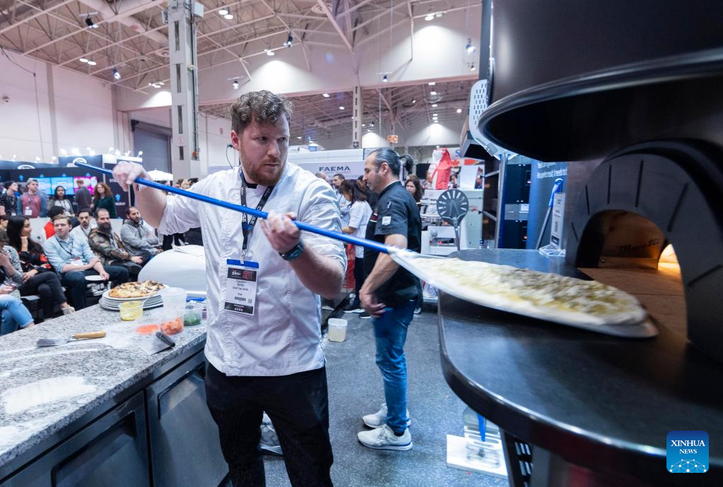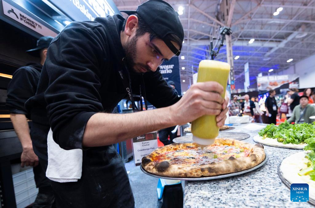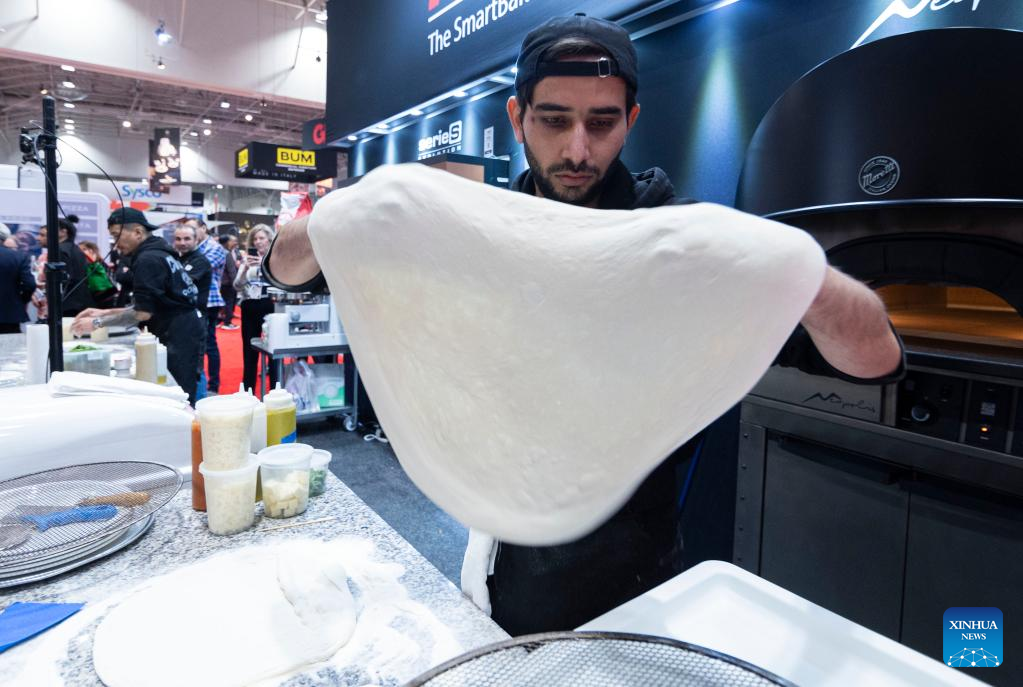 A contestant competes during a pizza competition at the 2023 Restaurants Canada Show (RC Show) in Toronto, Canada, on April 11, 2023. A total of 30 contestants from across Canada took part in the competition on Tuesday. (Photo by Zou Zheng/Xinhua)