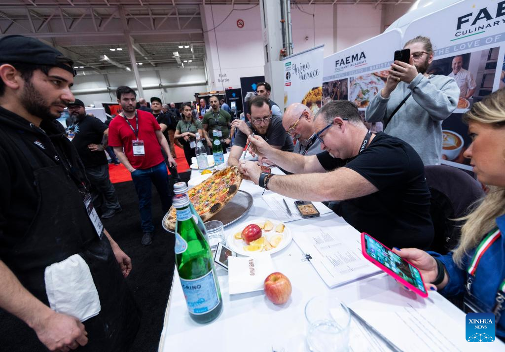 A judge checks a pizza baked by a contestant during a pizza competition at the 2023 Restaurants Canada Show (RC Show) in Toronto, Canada, on April 11, 2023. A total of 30 contestants from across Canada took part in the competition on Tuesday. (Photo by Zou Zheng/Xinhua)