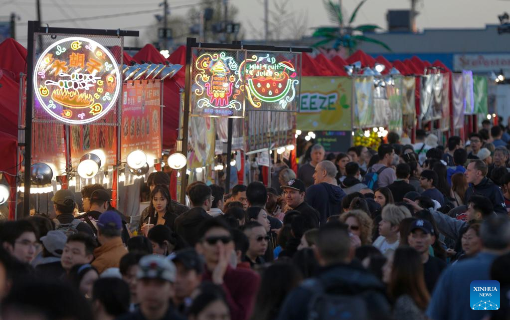 People visit food vendors at the Richmond Night Market in Richmond, British Columbia, Canada, on April 28, 2023. (Photo by Liang Sen/Xinhua)