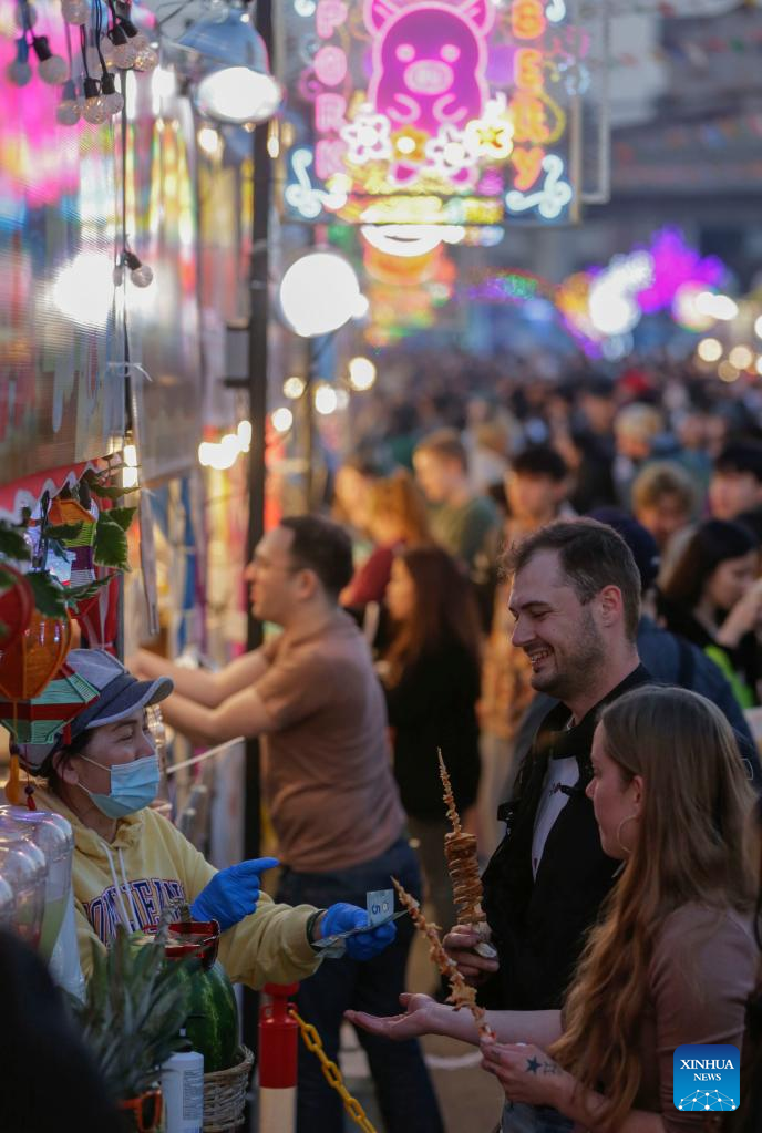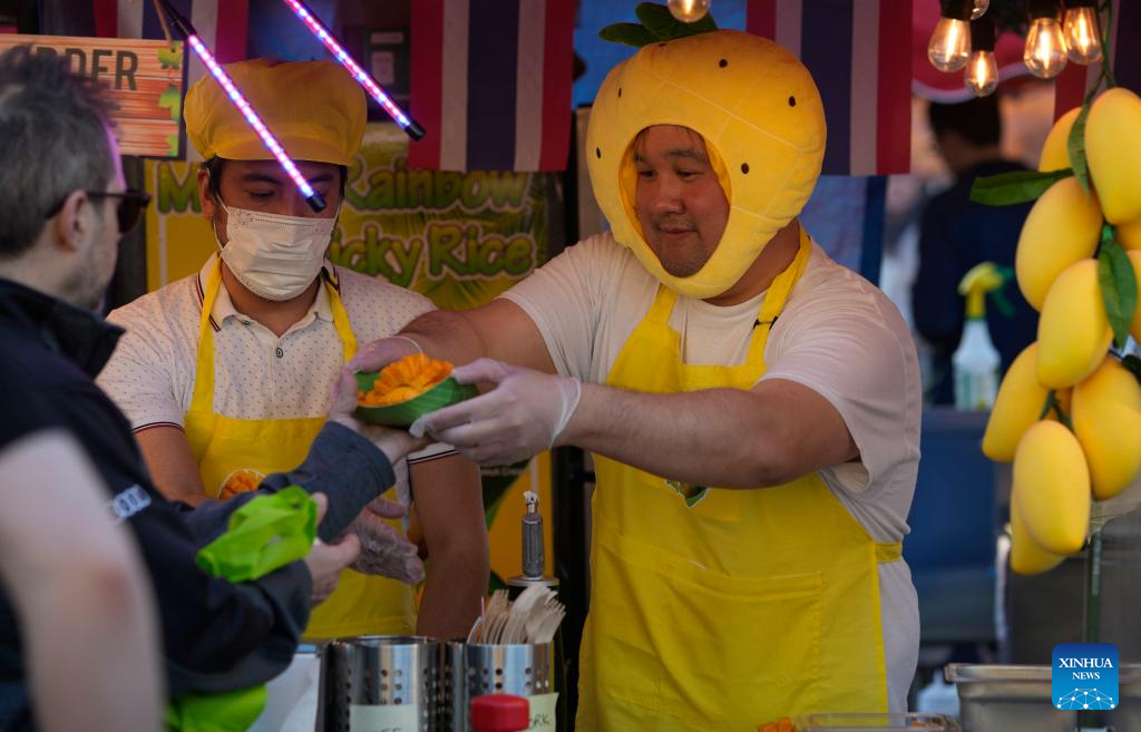 A food vendor hands over snacks to his customer at the Richmond Night Market in Richmond, British Columbia, Canada, on April 28, 2023. (Photo by Liang Sen/Xinhua)