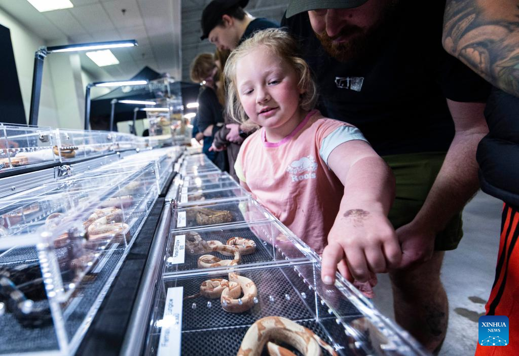 A girl looks at pet snakes during the 2023 Toronto Reptile and Plant Expo in Mississauga, Canada, on May 7, 2023. (Photo by Zou Zheng/Xinhua)