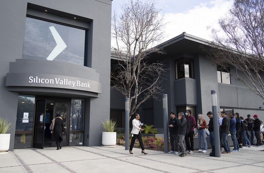 People queue up outside the headquarters of the Silicon Valley Bank (SVB) in Santa Clara, California, the United States, March 13, 2023. (Photo by Li Jianguo/Xinhua)