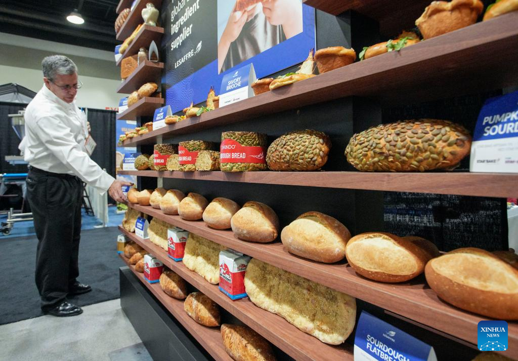 An exhibitor shows different types of bread during the Bakery Showcase 2023 held at the Vancouver Convention Centre in Vancouver, British Columbia, Canada, on May 14, 2023. (Photo by Liang Sen/Xinhua)