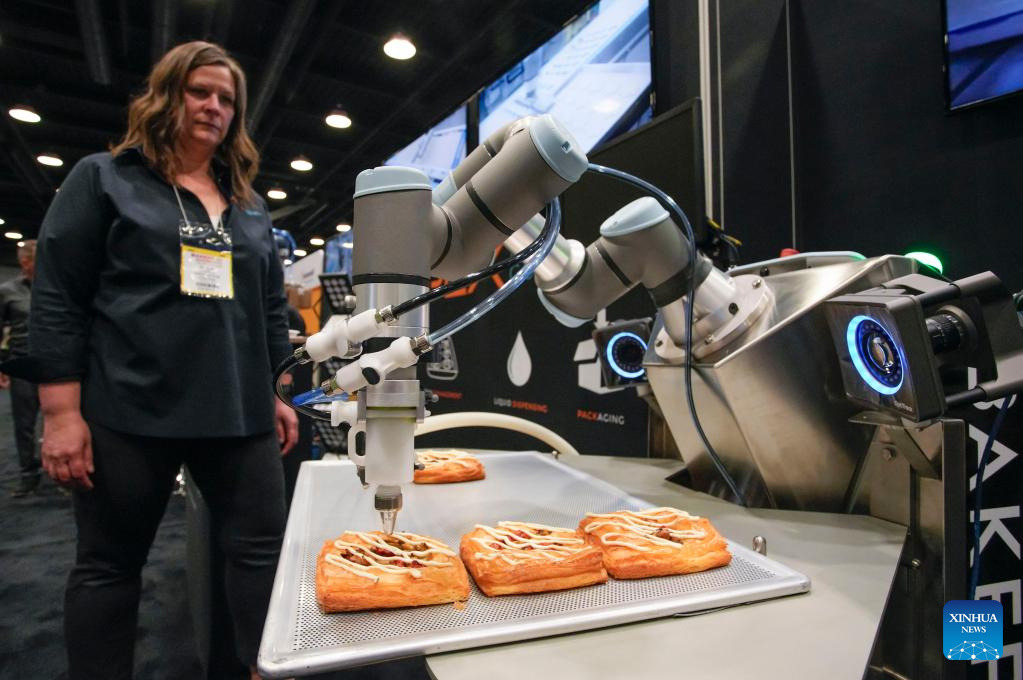 An exhibitor shows the process of bakery making by using robot arm during the Bakery Showcase 2023 held at the Vancouver Convention Center in Vancouver, British Columbia, Canada, on May 14, 2023. (Photo by Liang Sen/Xinhua)