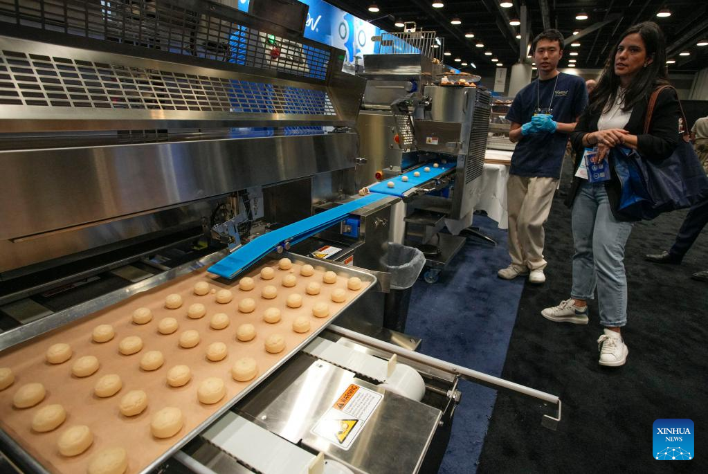 An automated food-baking equipment is displayed during the Bakery Showcase 2023 held at the Vancouver Convention Centre in Vancouver, British Columbia, Canada, on May 14, 2023. (Photo by Liang Sen/Xinhua)
