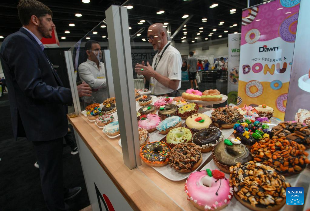 Different donut creations are displayed at a booth during the Bakery Showcase 2023 held at the Vancouver Convention Centre in Vancouver, British Columbia, Canada, on May 14, 2023. (Photo by Liang Sen/Xinhua)