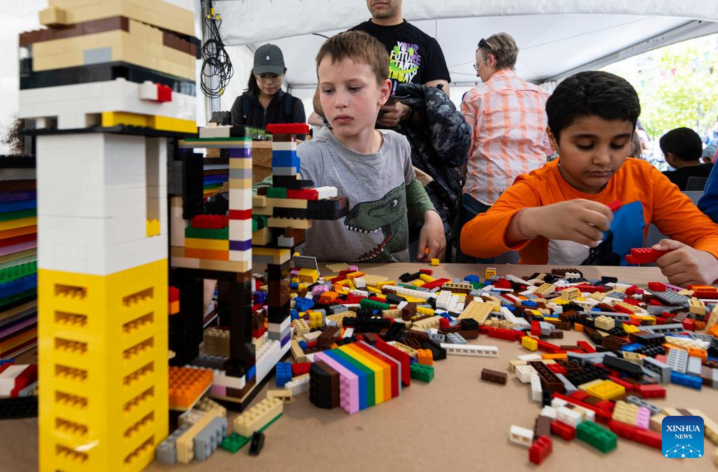 Children play with Lego bricks during the 2023 Junior International Children's Festival in Toronto, Canada, May 21, 2023. The event is held here from May 20 to 22 to inspire children to recognize their limitless potential and learn about the world around them. (Photo by Zou Zheng/Xinhua)