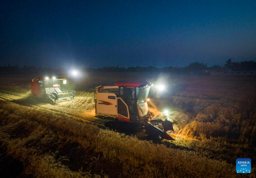 This aerial photo taken on June 6, 2023 shows villagers driving machineries to harvest wheat in Zhaizhuang Village of Jiangyan District, Taizhou City, east China's Jiangsu Province. Farmers in provinces including Shandong, Henan and Jiangsu have recently been busy with harvesting wheat. (Photo by Tang Dehong/Xinhua)