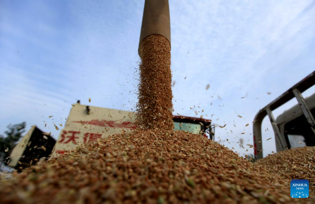 Harvested wheat is seen loaded onto a truck in Daguangliang Village of Pingyi County, Linyi City, east China's Shandong Province, June 7, 2023. Farmers in provinces including Shandong, Henan and Jiangsu have recently been busy with harvesting wheat. (Photo by Wu Jiquan/Xinhua)