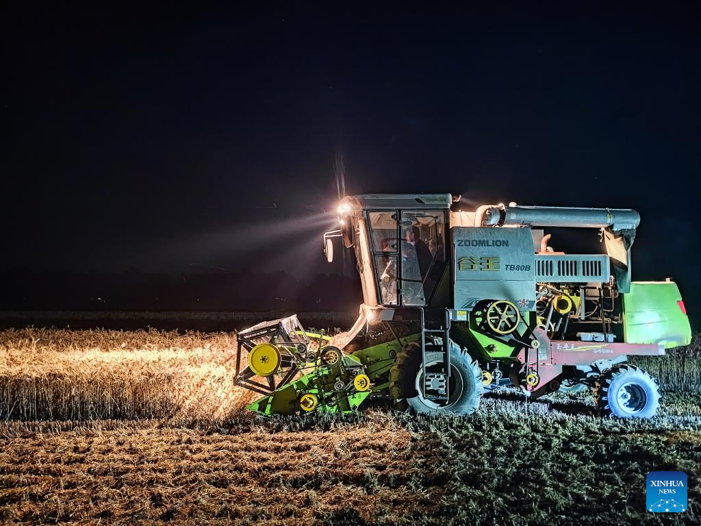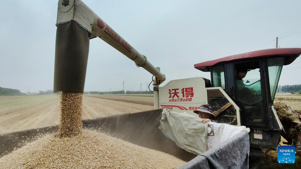 A villager drives a tractor to harvest wheat in Caoxian County of Heze City, east China's Shandong Province, June 6, 2023. Farmers in provinces including Shandong, Henan and Jiangsu have recently been busy with harvesting wheat. (Photo by Li Baozhu/Xinhua)