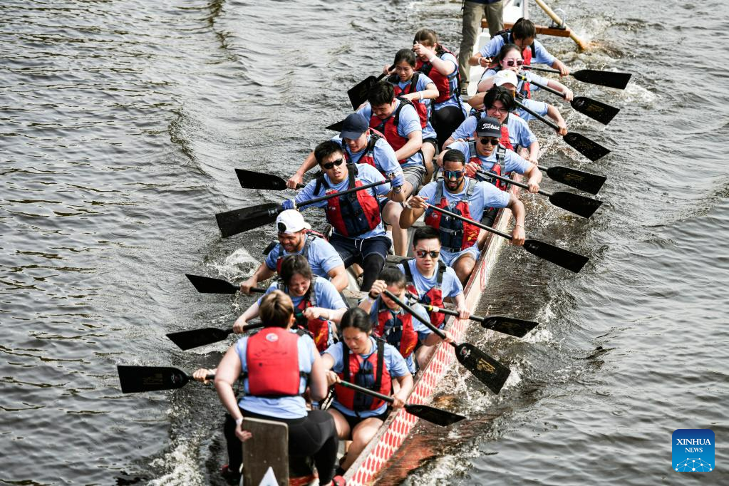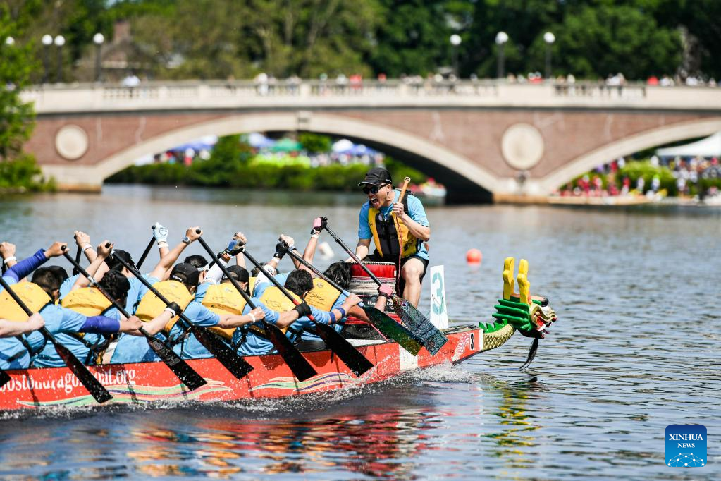 Participants compete at Boston Hong Kong Dragon Boat Festival in Cambridge, Massachusetts, the United States, on June 11, 2023. More than 60 teams took part in this event on Sunday. (Photo by Ziyu Julian Zhu/Xinhua)