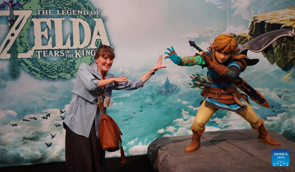 A visitor poses for photos during Licensing Expo 2023 in Las Vegas, the United States, on June 13, 2023. (Photo by Zeng Hui/Xinhua)