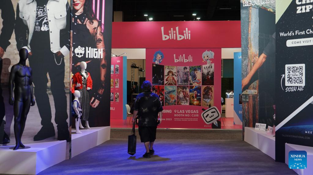 People visit the exhibition area of bilibili, a leading video community for young generations in China, during Licensing Expo 2023 in Las Vegas, the United States, on June 13, 2023. (Photo by Zeng Hui/Xinhua)