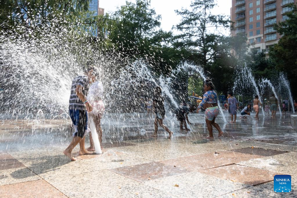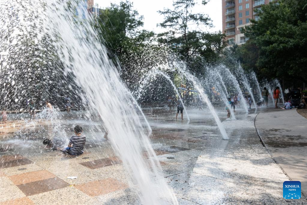Children play and cool off at a splash park in downtown Houston, Texas, United States, on June 15, 2023. From U.S. south central state of Texas to southeastern Florida, about 35 million people are bracing for a widespread heat wave which is expected to last for days, the U.S. National Weather Service (NWS) forecast on Thursday.