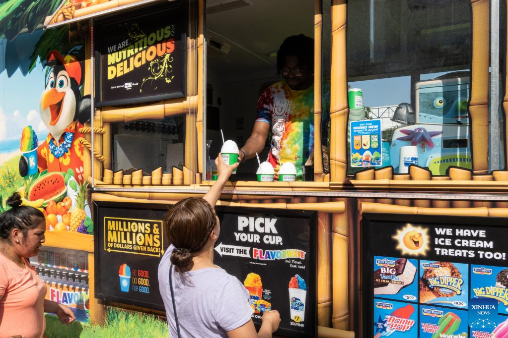 People buy cold drinks at a park in downtown Houston, Texas, United States, on June 15, 2023. From U.S. south central state of Texas to southeastern Florida, about 35 million people are bracing for a widespread heat wave which is expected to last for days, the U.S. National Weather Service (NWS) forecast on Thursday.