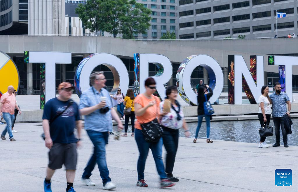 People walk past the Toronto Sign in Nathan Phillips Square in Toronto, Ontario, Canada, on June 16, 2023. Canada's population reached a milestone of 40 million as of June 16, 2023, Statistics Canada announced Friday. (Photo by Zou Zheng/Xinhua)