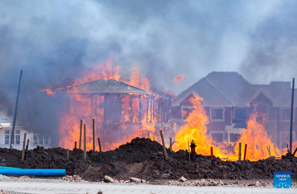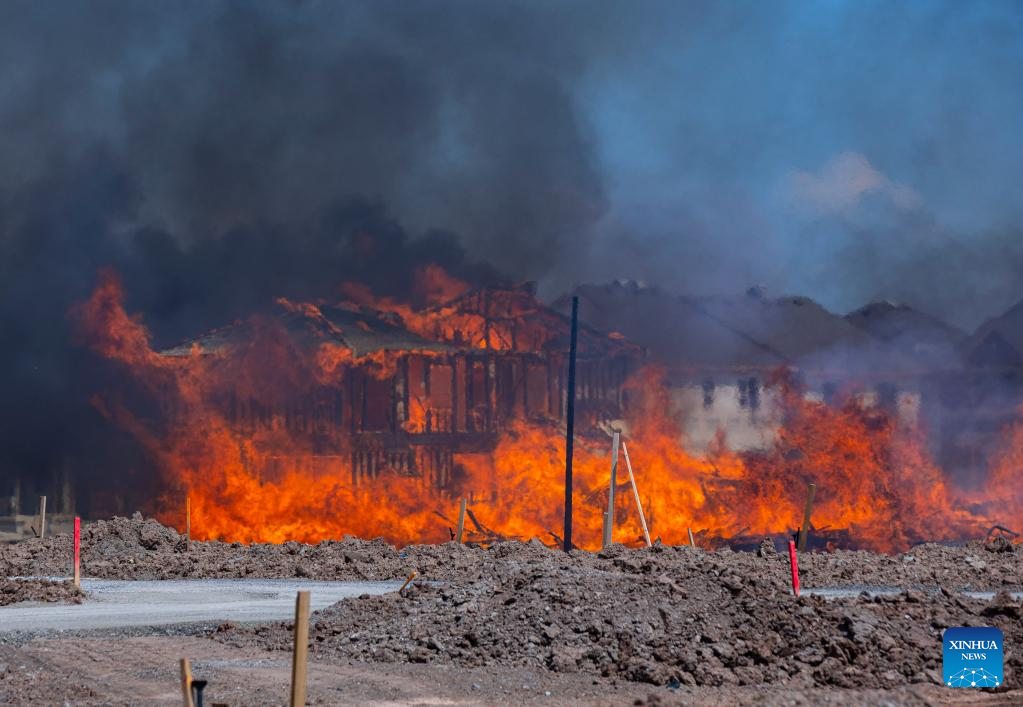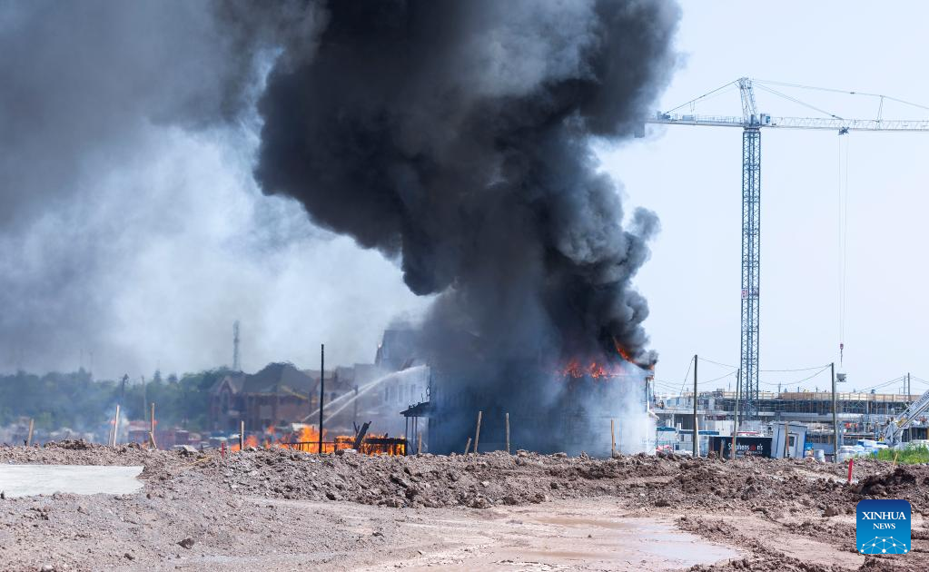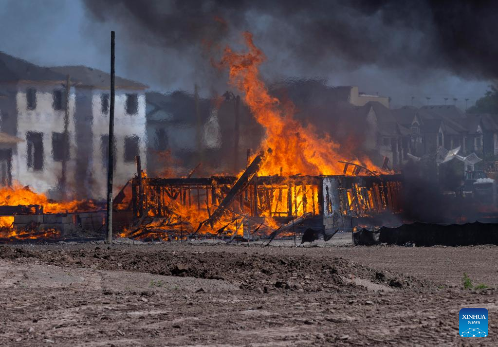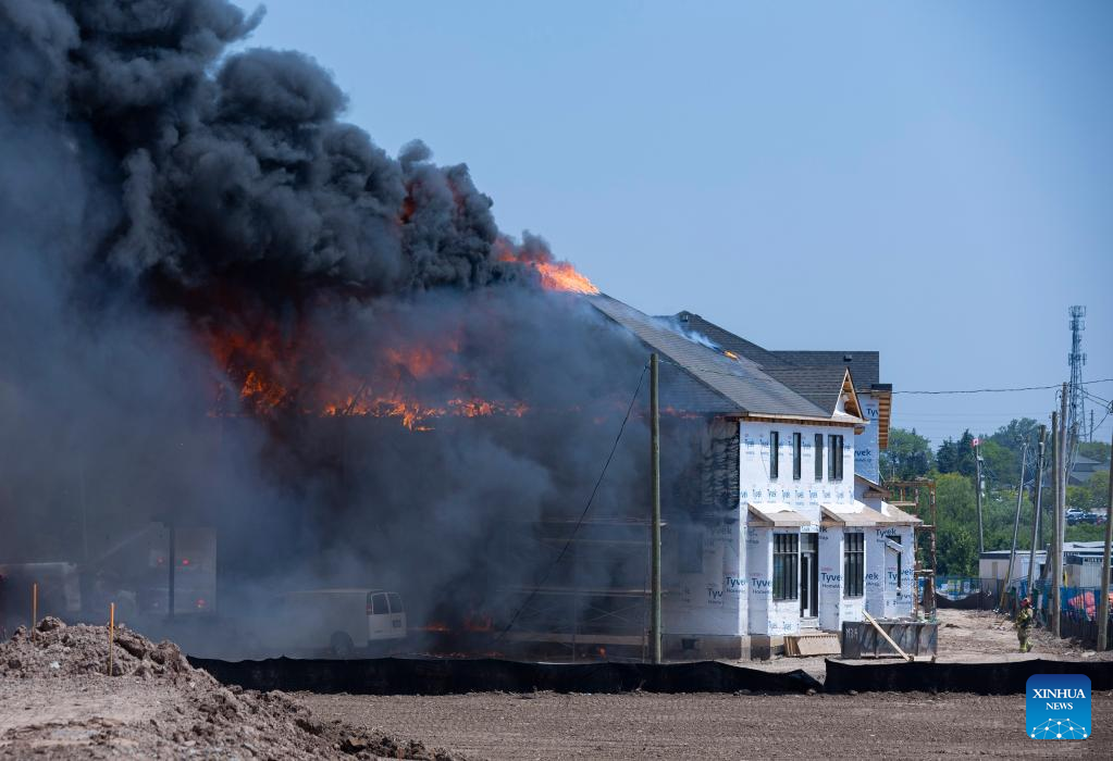 A fire breaks out at a residential construction site in Oakville, the Greater Toronto Area, Canada, on June 21, 2023. A large fire broke out in a new Oakville subdivision on Wednesday, destroying multiple new homes, according to local media. No injuries have been reported. (Photo by Zou Zheng/Xinhua)
