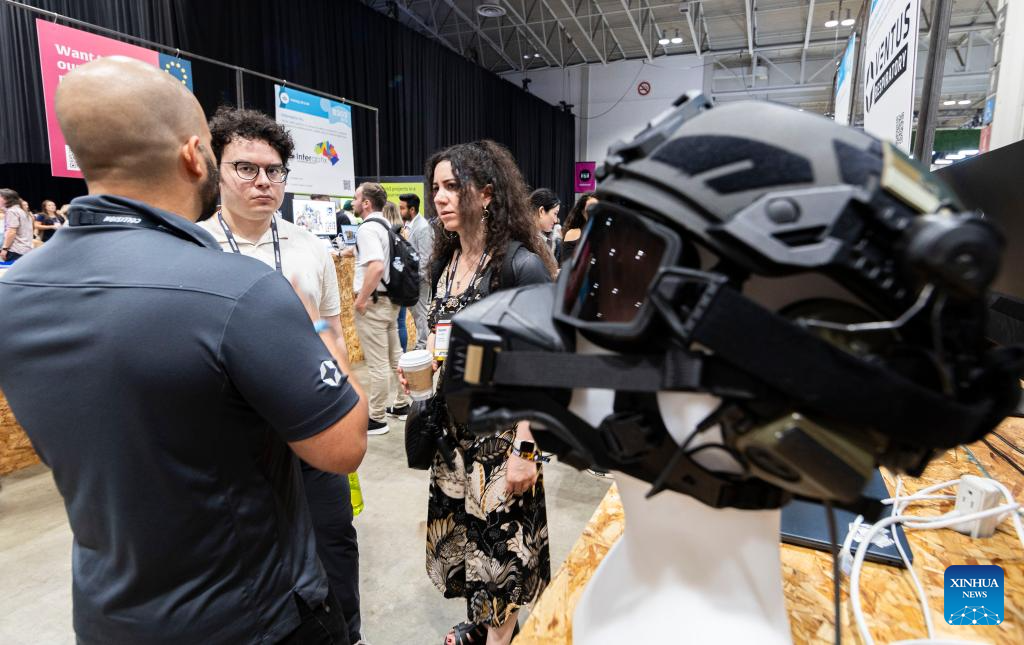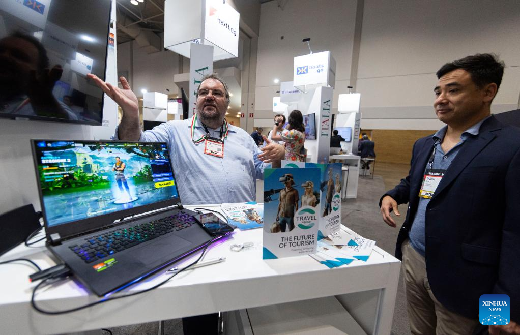 An exhibitor introduces a VR tourism project during the 2023 Collision Conference in Toronto, Canada, on June 27, 2023. The 2023 Collision Conference, an annual tech conference in North America, is held here from June 26 to June 29 this year. (Photo by Zou Zheng/Xinhua)