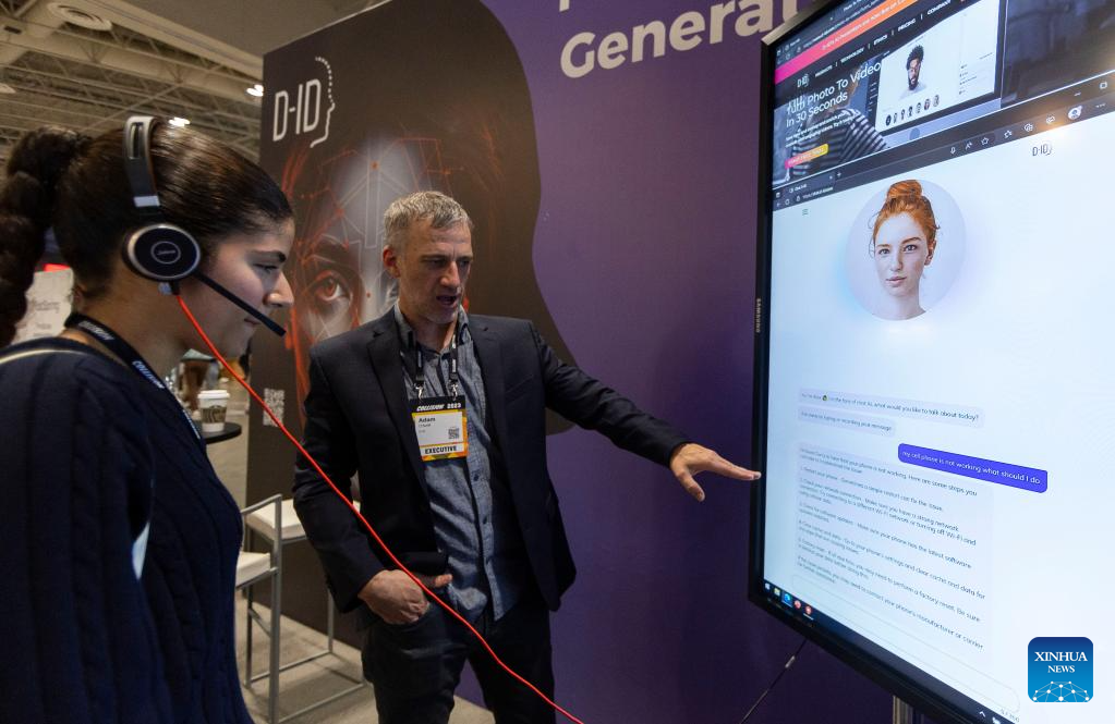 A woman experiences an AI device during the 2023 Collision Conference in Toronto, Canada, on June 27, 2023. The 2023 Collision Conference, an annual tech conference in North America, is held here from June 26 to June 29 this year. (Photo by Zou Zheng/Xinhua)