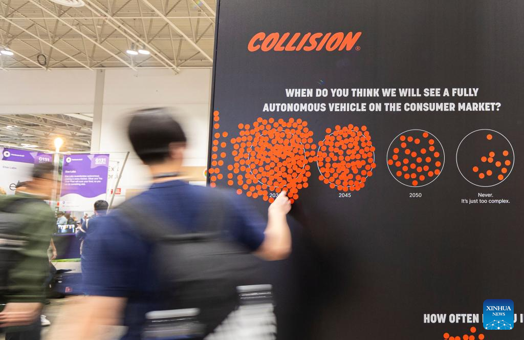 A man takes part in a fully automonous vehicle's survey during the 2023 Collision Conference in Toronto, Canada, on June 27, 2023. The 2023 Collision Conference, an annual tech conference in North America, is held here from June 26 to June 29 this year. (Photo by Zou Zheng/Xinhua)