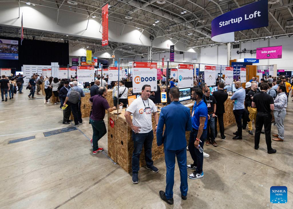 People visit start-ups' booths during the 2023 Collision Conference in Toronto, Canada, on June 27, 2023. The 2023 Collision Conference, an annual tech conference in North America, is held here from June 26 to June 29 this year. (Photo by Zou Zheng/Xinhua)