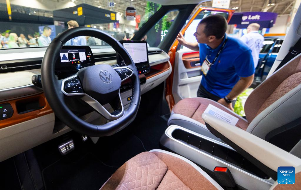 A man looks at a Volkswagen's electric vehicle ID. Buzz during the 2023 Collision Conference in Toronto, Canada, on June 27, 2023. The 2023 Collision Conference, an annual tech conference in North America, is held here from June 26 to June 29 this year. (Photo by Zou Zheng/Xinhua)