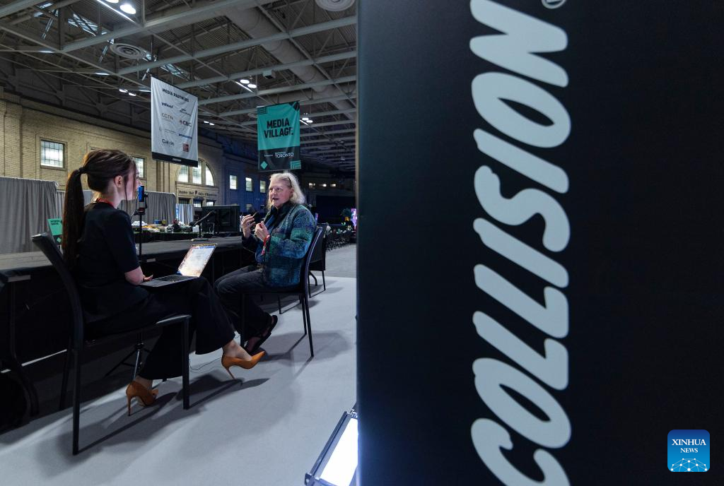 Thoughtworks' chief technology officer (CTO) Emerita Rebecca Parsons (L) speaks in an interview during the Collision conference in Toronto, Canada, on June 28, 2023. The executive of global technology consultancy company Thoughtworks said at the Collision conference on Wednesday that China is expected to become a superpower in artificial intelligence (AI) across the world by 2030. (Photo by Zou Zheng/Xinhua)