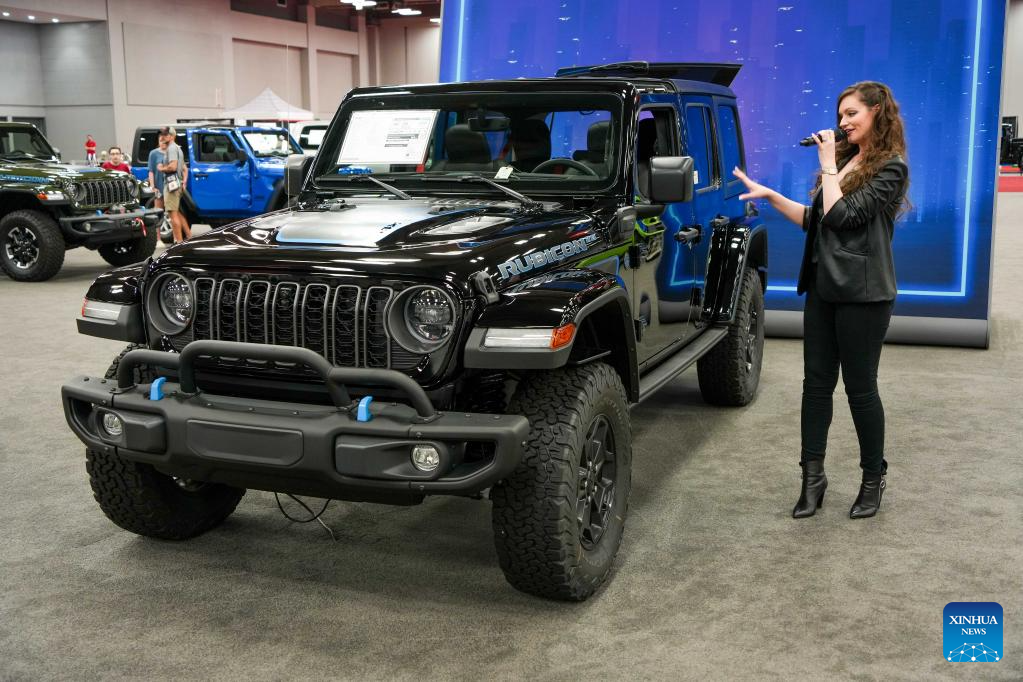 An exhibitor showcases a Jeep at the 2023 Austin Auto Show in Austin, Texas, the United States, on June 30, 2023. The 2023 Austin Auto Show kicked off here on Friday. (Photo by Bo Lee/Xinhua)