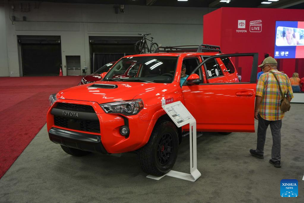 People look at a Toyota 4 Runner at the 2023 Austin Auto Show in Austin, Texas, the United States, on June 30, 2023. The 2023 Austin Auto Show kicked off here on Friday. (Photo by Bo Lee/Xinhua)