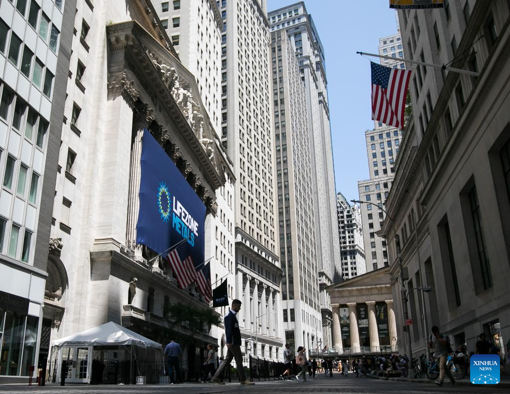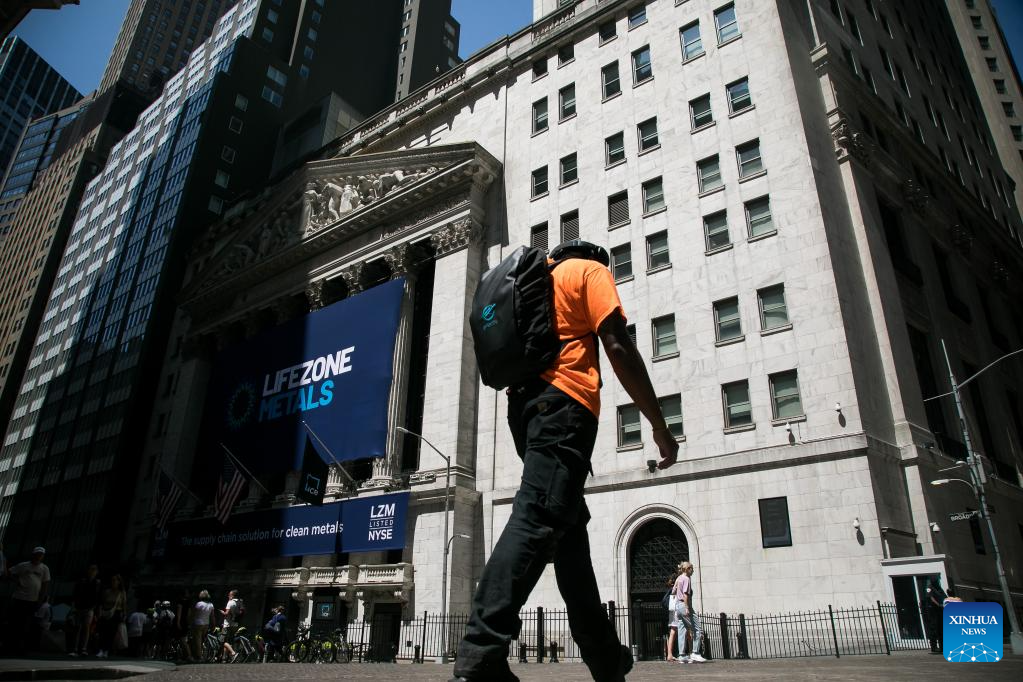 Pedestrains walk past the building of the New York Stock Exchange (NYSE) in New York, the United States, on July 6, 2023. U.S. stocks ended lower on Thursday as strong private hiring data fueled bets the Federal Reserve will have to take a more aggressive approach to tame inflation, which sent U.S. Treasury yields higher and weighed on equity markets. The Dow Jones Industrial Average fell 366.38 points, or 1.07 percent, to 33,922.26. The S&P 500 lost 35.23 points, or 0.79 percent, to 4,411.59. The Nasdaq Composite Index declined 112.61 points, or 0.82 percent, to 13,679.04. (Photo by Michael Nagle/Xinhua)