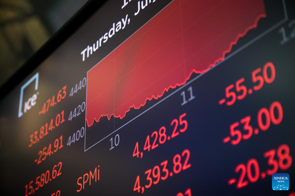 A screen displays stock market information on the floor of the New York Stock Exchange (NYSE) in New York, the United States, on July 6, 2023. U.S. stocks ended lower on Thursday as strong private hiring data fueled bets the Federal Reserve will have to take a more aggressive approach to tame inflation, which sent U.S. Treasury yields higher and weighed on equity markets. The Dow Jones Industrial Average fell 366.38 points, or 1.07 percent, to 33,922.26. The S&P 500 lost 35.23 points, or 0.79 percent, to 4,411.59. The Nasdaq Composite Index declined 112.61 points, or 0.82 percent, to 13,679.04. (Photo by Michael Nagle/Xinhua)