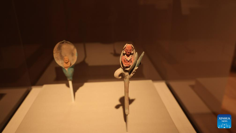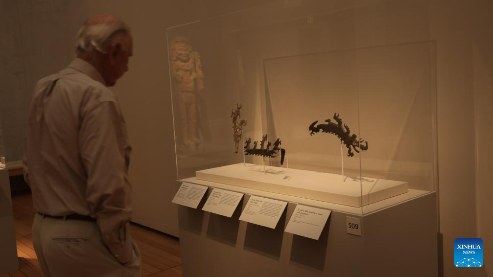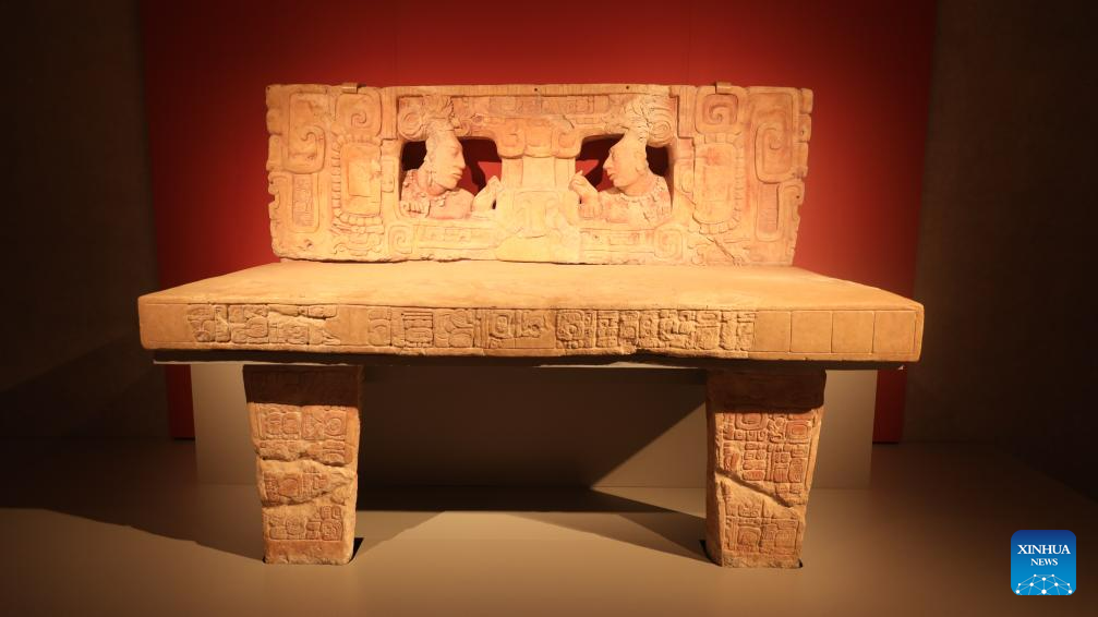 Maya artworks are seen during a special exhibition titled "Lives of the Gods: Divinity in Maya Art" at Kimbell Art Museum in Fort Worth, Texas, the United States, on July 14, 2023. The special exhibition is held at Kimbell Art Museum from May 7 to Sept. 3, with nearly 100 rarely seen masterpieces and recent discoveries to depict episodes in the life cycle of the gods. (Xinhua/Xu Jianmei)