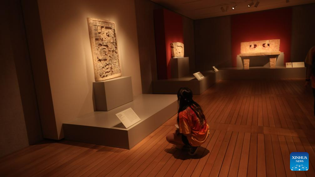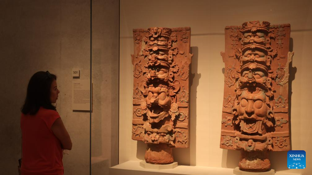 A visitor views Maya artworks at Kimbell Art Museum in Fort Worth, Texas, the United States, on July 14, 2023. A special exhibition titled "Lives of the Gods: Divinity in Maya Art" is held at Kimbell Art Museum from May 7 to Sept. 3, with nearly 100 rarely seen masterpieces and recent discoveries to depict episodes in the life cycle of the gods. (Xinhua/Xu Jianmei)