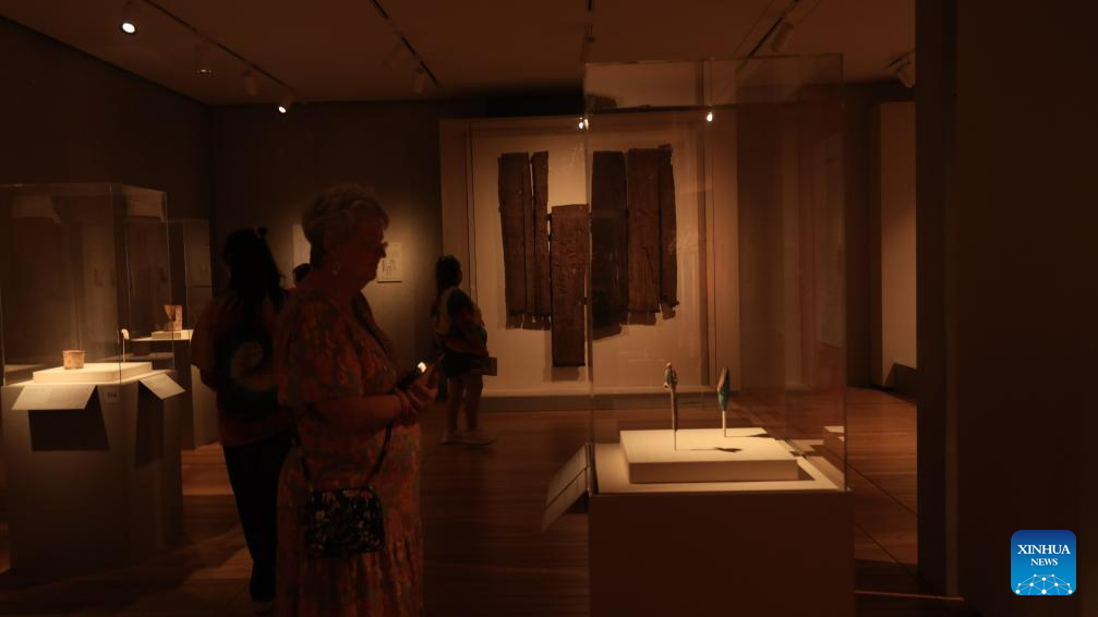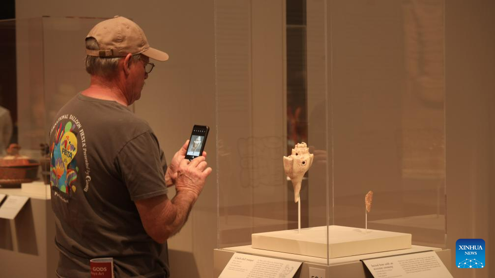 Visitors attend a special exhibition titled "Lives of the Gods: Divinity in Maya Art" at Kimbell Art Museum in Fort Worth, Texas, the United States, on July 14, 2023. The special exhibition is held at Kimbell Art Museum from May 7 to Sept. 3, with nearly 100 rarely seen masterpieces and recent discoveries to depict episodes in the life cycle of the gods. (Xinhua/Xu Jianmei)