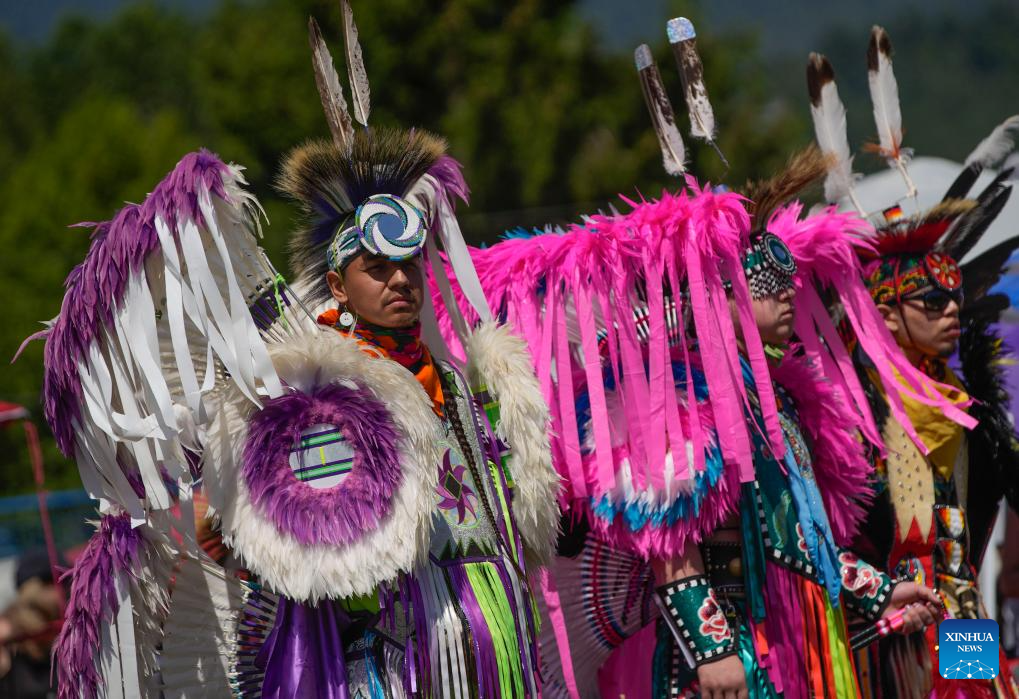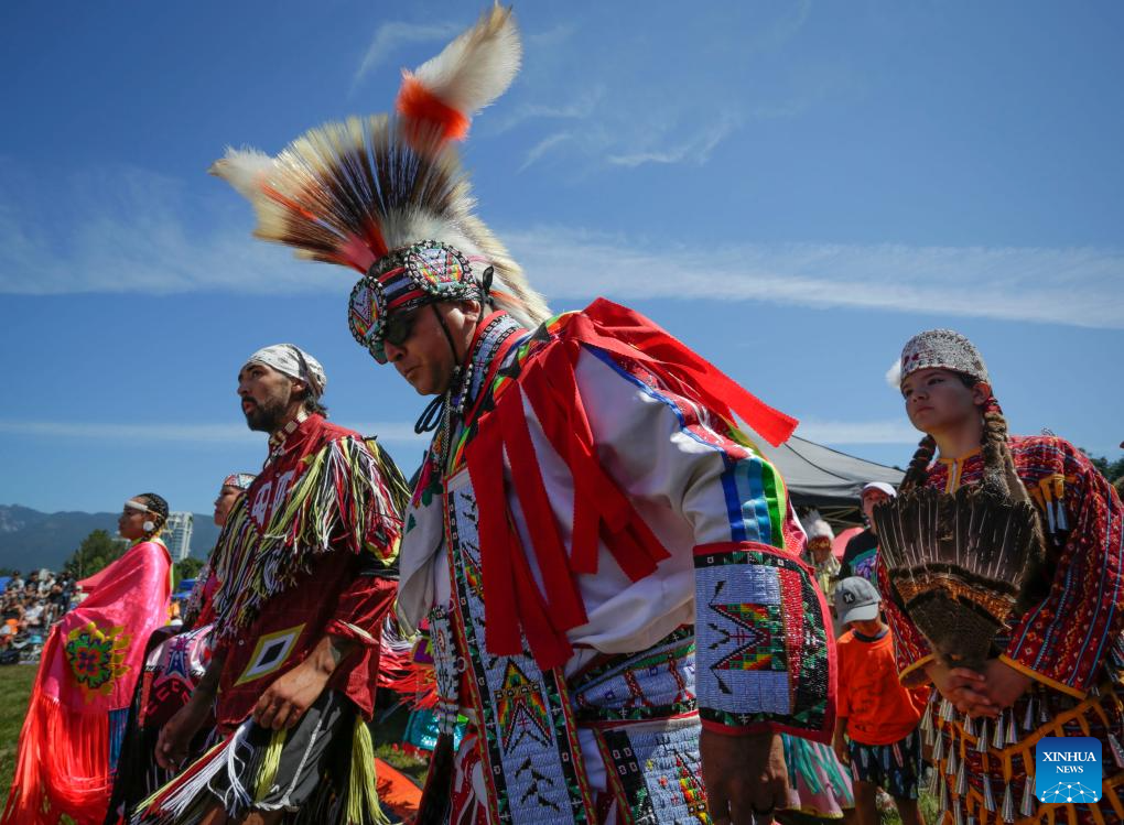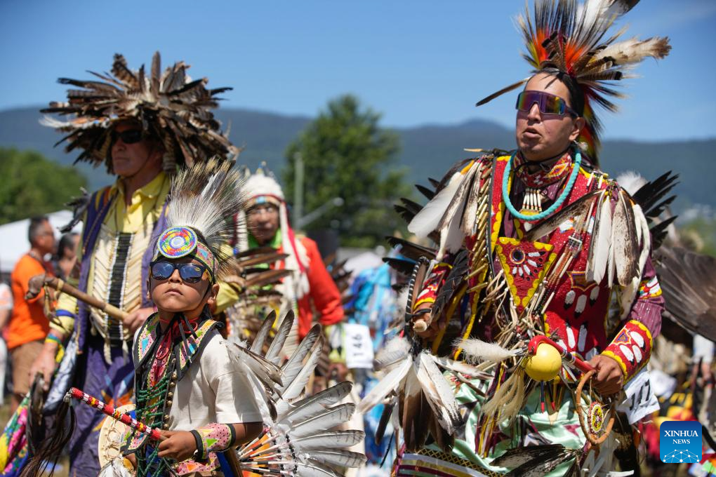Dancers perform during the Squamish Nation Youth Pow Wow at Capilano Reserve Park in Vancouver, Canada, on July 15, 2023. Pow Wow is an indigenous cultural activity in which people socialize together with different activities like dancing, singing, and honouring the traditions of their ancestors. (Photo by Liang Sen/Xinhua)
