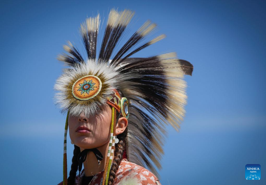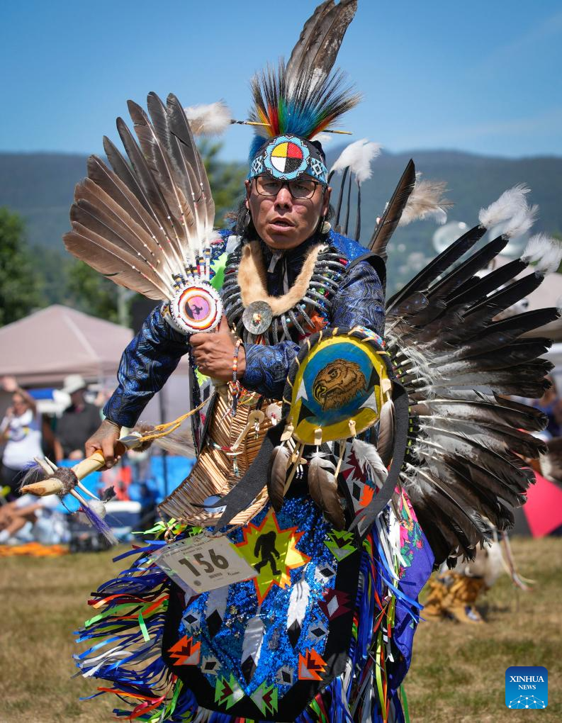 A dancer dressed in indigenous costumes is seen during the Squamish Nation Youth Pow Wow at Capilano Reserve Park in Vancouver, Canada, on July 15, 2023. Pow Wow is an indigenous cultural activity in which people socialize together with different activities like dancing, singing, and honouring the traditions of their ancestors. (Photo by Liang Sen/Xinhua)