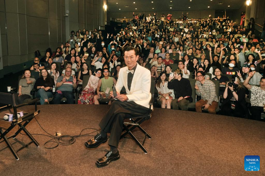 Actor Louis Koo poses for a group photo with audience at an awarding ceremony in New York, the United States, on July 19, 2023. Louis Koo, one of Hong Kong's biggest stars, was honored with the prestigious Extraordinary Star Asia Award at the New York Asian Film Festival on Wednesday. (Hong Kong Economic and Trade Office in New York/Handout via Xinhua)